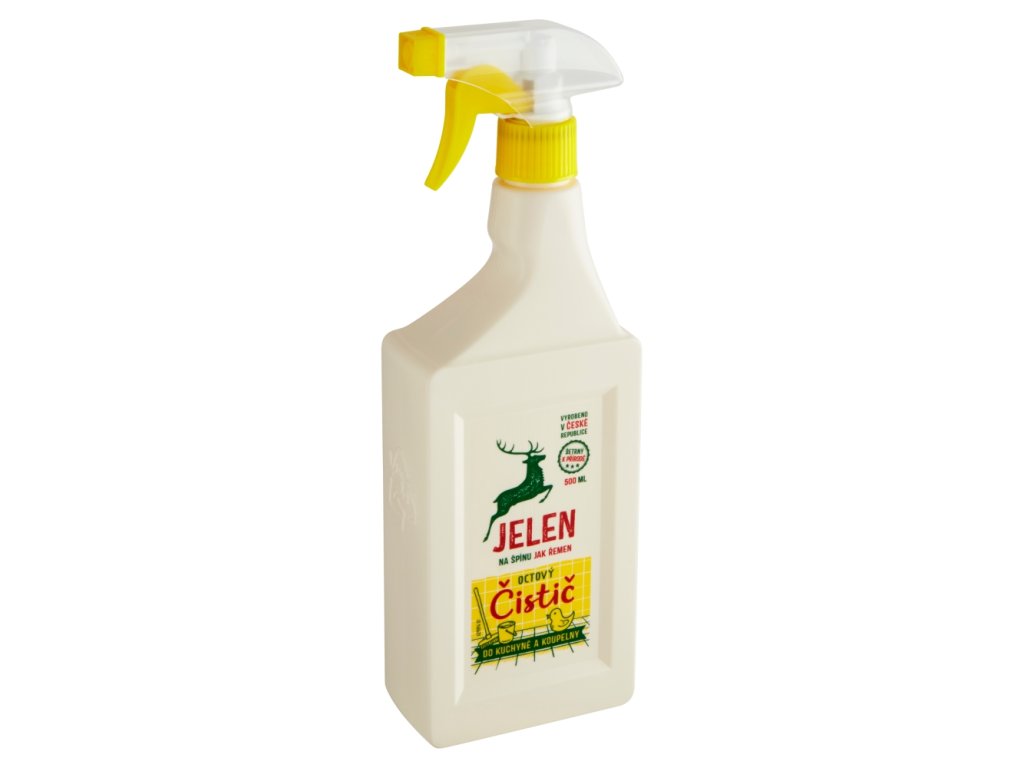 Jelen octový čistič na vodní kámen a urputnou špínu. Už Jelenova babička drhla vodní kámen a silnou špínu octem. Proto Jelenův čisič na bázi octa v kuchyni i koupelně tak dobře funguje. Nechtě jej po nanesení chvíli působit a pak teprve vyčistěte a opláchněte. Bude-li potřeba, vůni octa vyvětrejte. Vyvarujte se povrchů citlivých na kyseliny.