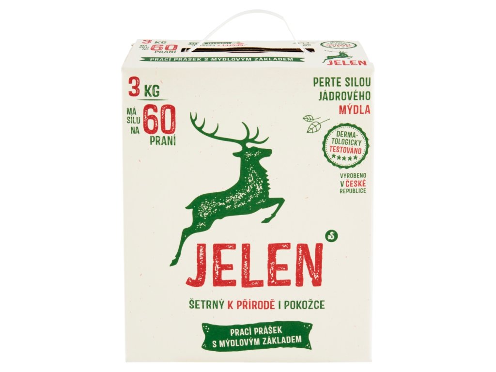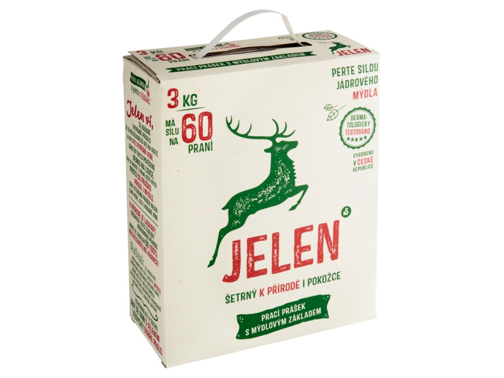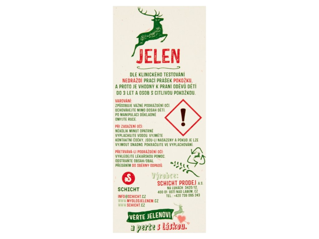 Obsahuje výhradně přírodní látky, které se ve vodě rychle, úplně a přirozeně ekologicky rozkládají. Neobsahuje žádné syntetické látky, alergenní parfemace, umělá barviva, bělidla ani fosfát, zato vysoký podíl pravého mýdla vyrobeného z tuků. Léta prověřila, že je Jelen spolehlivým pomocníkem na nejodolnější špínu a skvrny, třeba z třešní nebo čokolády, kterou děti pokoutně pojídají v peřinách. Jelen dobře vypere barevné i bílé prádlo. Vystačí na 60 praček.