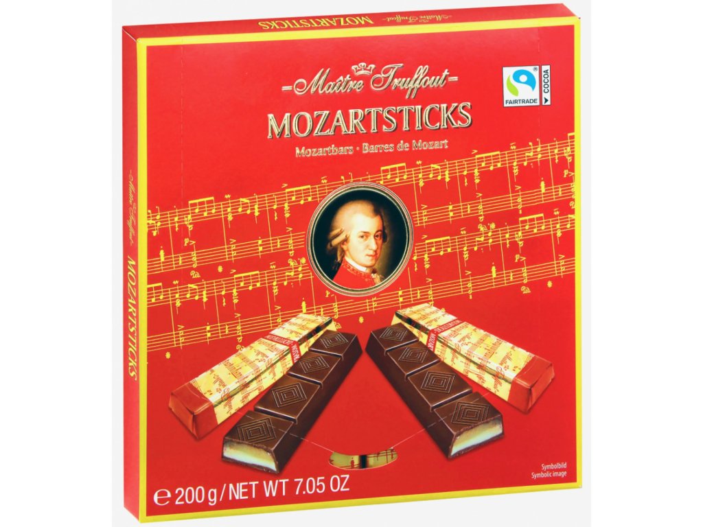 Jednotlivě balené Mozartovy tyčinky v jemně hořké čokoládě plněné náplní z marcipánu 25% a náplní s pistáciemi 25%. Mozartovy tyčinky jsou skvělým nápadem na dárek.