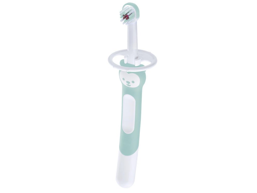 Extra dlouhá rukojeť pro společné čištění zoubků Dětský kartáček na zuby MAM Training Brush byl vyvinut s lékařskými odborníky a lze jej používat již od 1. zoubku. Designéři MAM vytvořili rukojeť kartáčku Training Brush speciálně dlouhou a ergonomicky tvarovanou, aby ji rodiče mohli držet společně s dítětem. Rodiče tak mohou dětem ukázat, jak na správné čištění zoubků. Měkké, zaoblené štětiny čistí první zoubky a odstraňují plak a bakterie. Červené štětinky označují doporučené množství zubní pasty. Zaoblená hlava kartáčku je perfektní pro malá dětská ústa. Bezpečnostní kryt pomáhá udržet kartáček v bezpečné vzdálenosti od zadní části úst dítěte.Doplňkové parametry