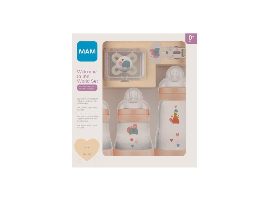 Set pro miminko MAM Dárkový set "Vítej na světě" pro novorozence je ideálním dárkem pro nastávající maminku. Dárkový set v růžové barvě obsahuje 2x MAM Lahev Anti-Colic 160 ml, 1x MAM Lahev Anti-Colic 260 ml, 1x MAM dudlík Start (0-2 měsíce) v praktické sterilizačním boxu a 1x MAM Clip pásek na dudlík. Lahev Anti-Colic je skvělým pomocníkem při přechodu mezi kojením a pitím z lahve. Speciálně navržené dno s průduchy zajišťuje plynulé a klidné pití. Lahve mají silikonové savičky. Dudlík MAM Start je ideální volbou pro právě narozená miminka. Tvar savičky je anatomicky vhodný pro správný vývoj zoubků, navíc je vždy ve správné sací pozici. Díky chytrému designu lze pásek na dudlík MAM Clip používat pouze jednou rukou a lze jej snadno a rychle upevnit na letní i zimní oděv.Doplňkové parametry