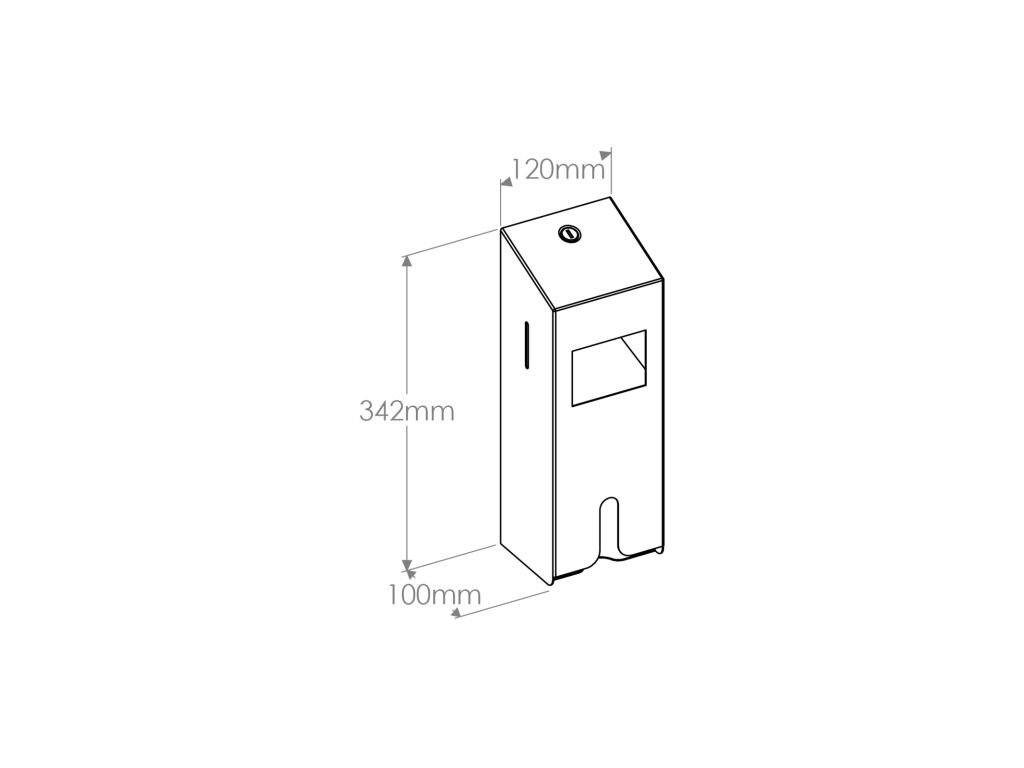 Zásobník pojme až 35 vložek a 30 tamponů (normal velikosti), je uzamykatelný odolným ocelovým zámkem a díky neviditelným pantům a broušeným svarům působí minimalisticky a profesionálně.