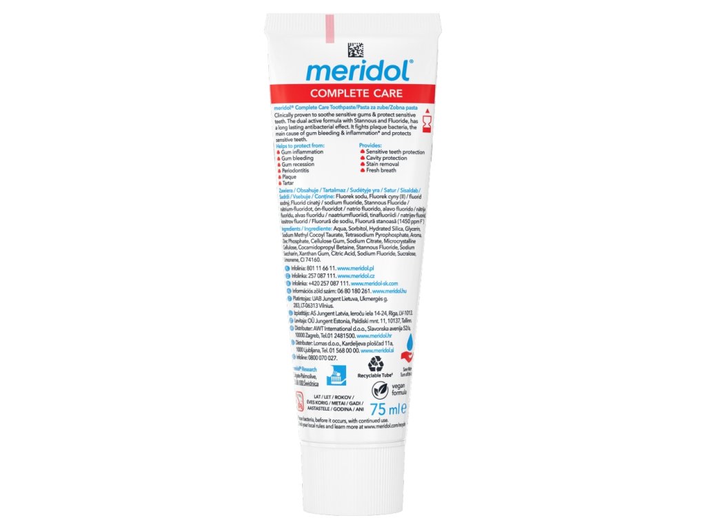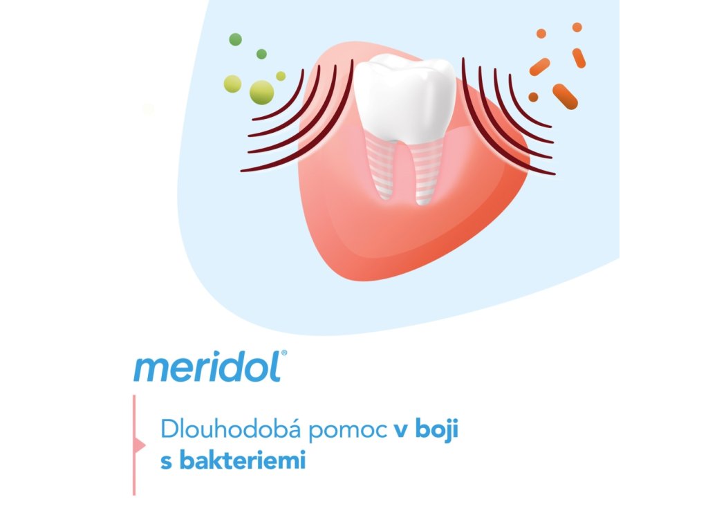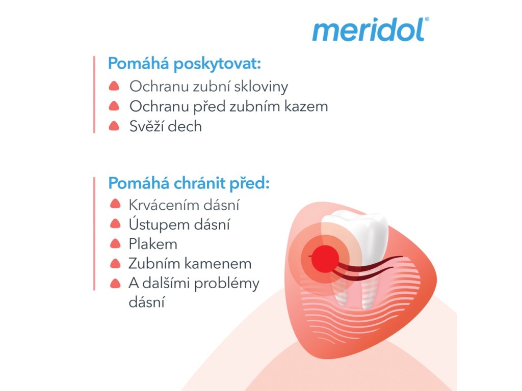Meridol obsahuje kombinaci dlouhodobě působících aktivních složek aminfluoridu a fluoridu cínatého - zubní pasta Meridol odstraňuje zbytky bakteriálního plaku, které zůstanou po čištění zubním kartáčkem, a vyznačuje se dlouhotrvajícím ochraným účinkem proti tvorbě nového plaku, který pokračuje ještě dlouho po čištění. Zubní pasta Meridol tímto způsobem podporuje přirozenou regeneraci podrážděných dásní. Tato unikátní kombinace aktivních složek rovněž poskytuje optimální ochranu před vznikem zubního kazu. Klinické studie prokázaly, že účinnější ochrany před zánětem dásní je dosaženo při společném použití zubní pasty Meridol a ústní vody Meridol.