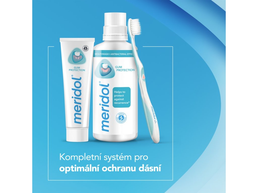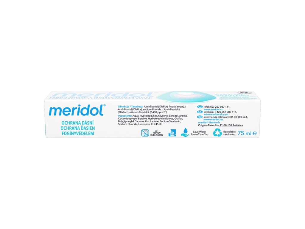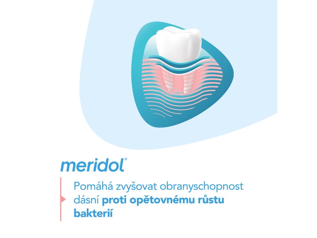 Meridol obsahuje kombinaci dlouhodobě působících aktivních složek aminfluoridu a fluoridu cínatého - zubní pasta Meridol odstraňuje zbytky bakteriálního plaku, které zůstanou po čištění zubním kartáčkem, a vyznačuje se dlouhotrvajícím ochraným účinkem proti tvorbě nového plaku, který pokračuje ještě dlouho po čištění. Zubní pasta Meridol tímto způsobem podporuje přirozenou regeneraci podrážděných dásní. Tato unikátní kombinace aktivních složek rovněž poskytuje optimální ochranu před vznikem zubního kazu. Klinické studie prokázaly, že účinnější ochrany před zánětem dásní je dosaženo při společném použití zubní pasty Meridol a ústní vody Meridol.