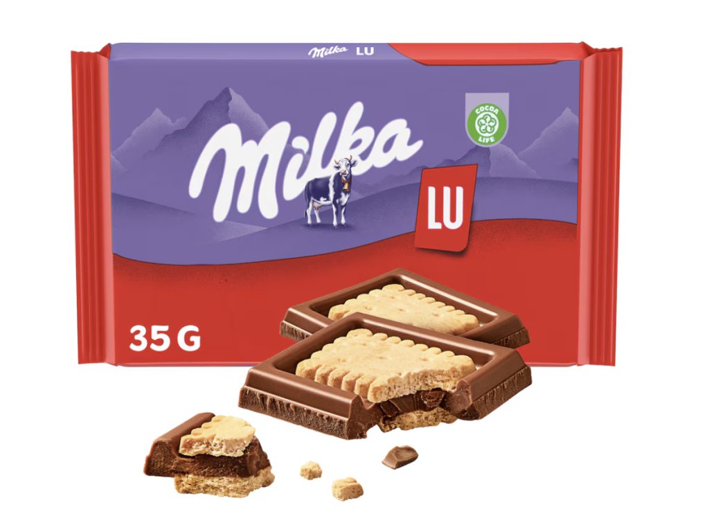 Mléčná čokoláda, kousky/sušenky LU. Obsahuje mléko a lepek (pšenice); může obsahovat sóju a ořechy. Vždy se řiďte údajem na obalu konkrétní šarže.
