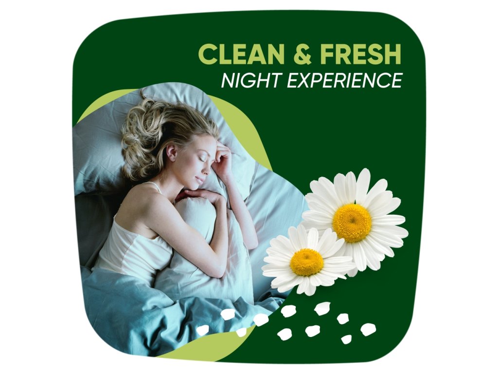 Vložky Naturella Ultra Night Camomile s křidélky, které vložky pomáhají držet na místě, jsou jemné a zajistí vám ochranu během nocí se silným výtokem. Jedná se o jediné výrobky pro ženskou hygienu, které obsahují krém Dermacrem – jedinečný suchý krém chránící pokožku, u něhož bylo klinicky prokázáno, že pomáhá předcházet jejímu podráždění. Tyto vložky Naturella Ultra Night jsou 2 mm tenké a mají vůni po heřmánku a exkluzivní absorpční systém s květinovým vzorem. Kromě toho obsahují gelové perly s úžasnou absorpční schopností, které tekutinu odvádějí pryč od pokožky a zanechávají po celou noc pocit sucha a pohodlí.