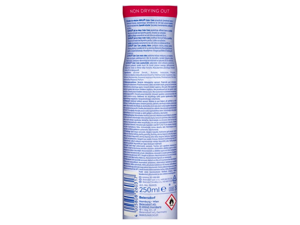Nivea Color Care & Protect lak na vlasy až po dobu 24 hodin intenzivně fixuje účes a chrání barvu. Má speciální pečující účinek, který vlasy nevysušuje a dodává jim sílu. Nivea Color Care & Protect lak na vlasy zachovává zářivý lesk vaší barvy a je možné jej lehko vyčesat.