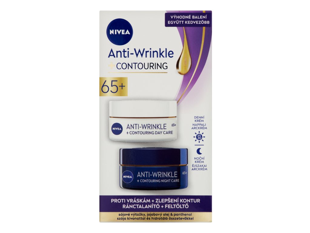 Dejte sbohem vráskám i povadlé pleti. Bohatý krém s vysokou UV ochranou účinně předchází vzniku pigmentových skvrn a viditelně redukuje i hluboké vrásky. Hydratační složení se sójovými výtažky zlepší kontury pleti a dodá jí potřebnou vzpruhu. Nechte svoji pleť znovu zazářit, vsaďte na: NIVEA Denní krém pro zlepšení kontur 65+ s OF 30. Noční krém v sadě je bez ochranného faktoru .