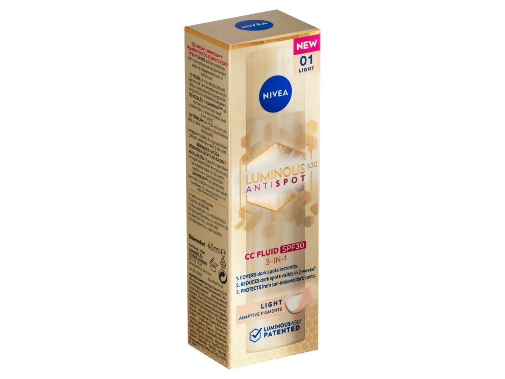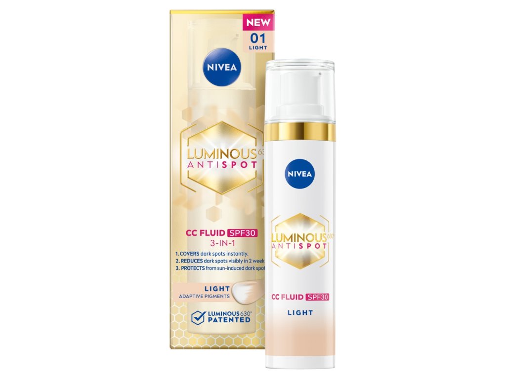 Rozzářená a přirozeně sjednocená pleť každý den? Vyzkoušejte CC krém LUMINOUS630®. Díky OF 30 je ideálním parťákem na krytí nedokonalostí pleti i na ochranu před škodlivým slunečním zářením. Obsahuje patentovanou látku LUMINOUS630®, která redukuje tmavé skvrny a sjednocuje tak tón pleti. Barevné pigmenty se přizpůsobí tónu pleti a zakryje pigmentové skvrny stejně tak, jako další nedokonalosti, které se na pleti objevují. Zakryjte nedokonalosti vaší pleti, ochraňte ji před slunečním zářením a zbavte se zároveň i tmavých pigmentových skvrn. Vyzkoušejte NIVEA CC krém 3v1.