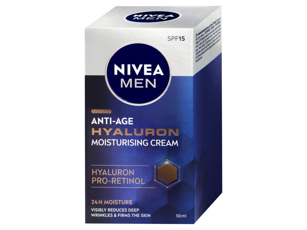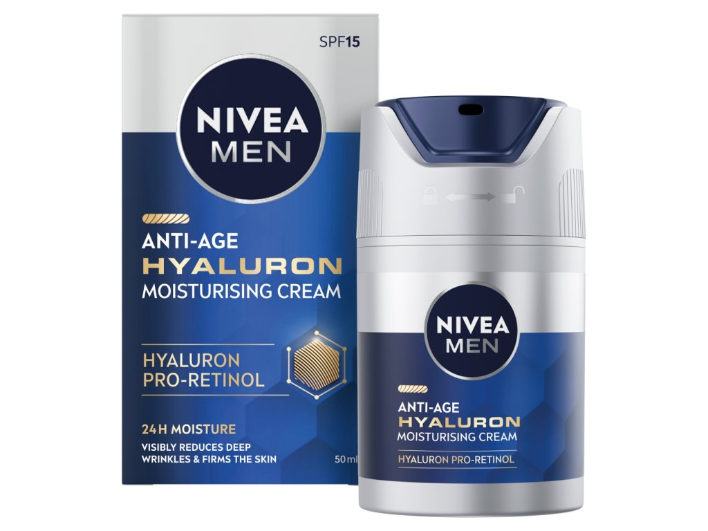 NIVEA Hydratační pleťový krém proti vráskám Hyaluron pro muže obsahuje čistou kyselinu hyaluronovu. Ta aktivuje pleťové buňky, tím redukuje už vzniklé vrásky a navrátí vaší pleti pevnost. Zároveň se postará o to, aby byla pleť hydratovaná až 24 hodin a díky OF 15 chráněná před sluncem. Zvolte si pevnou, svěží pleť a vyzkoušejte: NIVEA MEN Hydratační pleťový krém proti vráskám Hyaluron.
