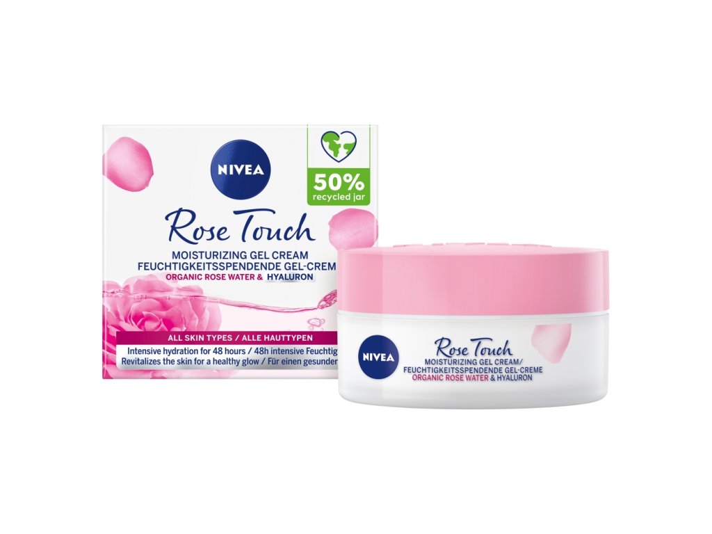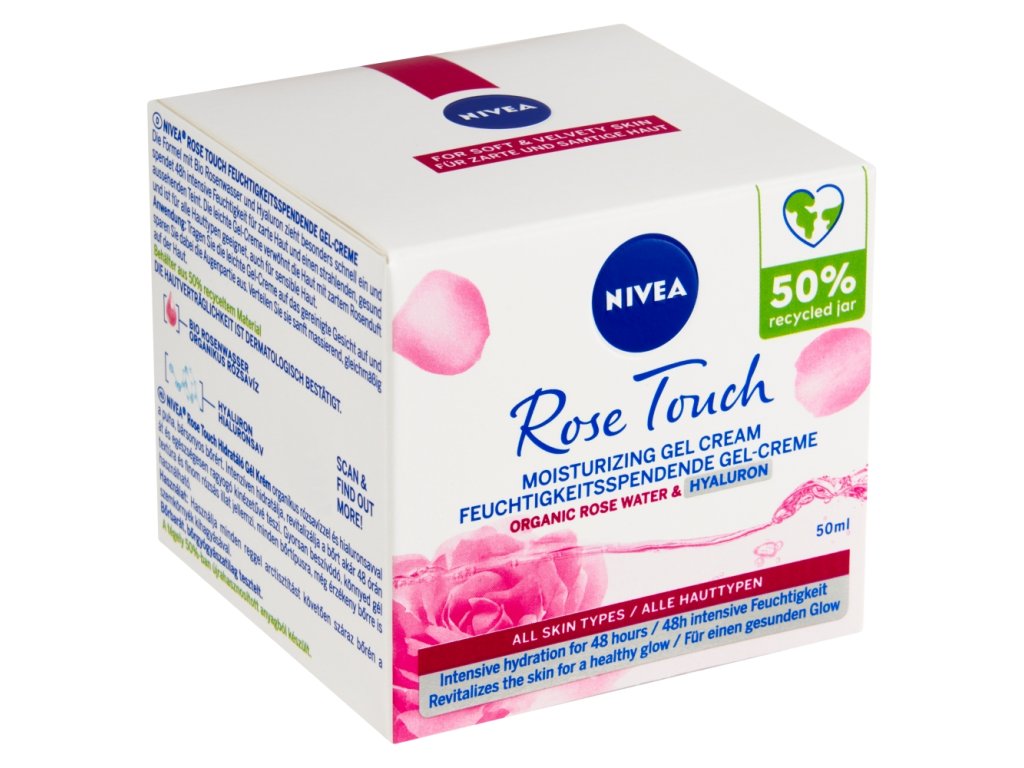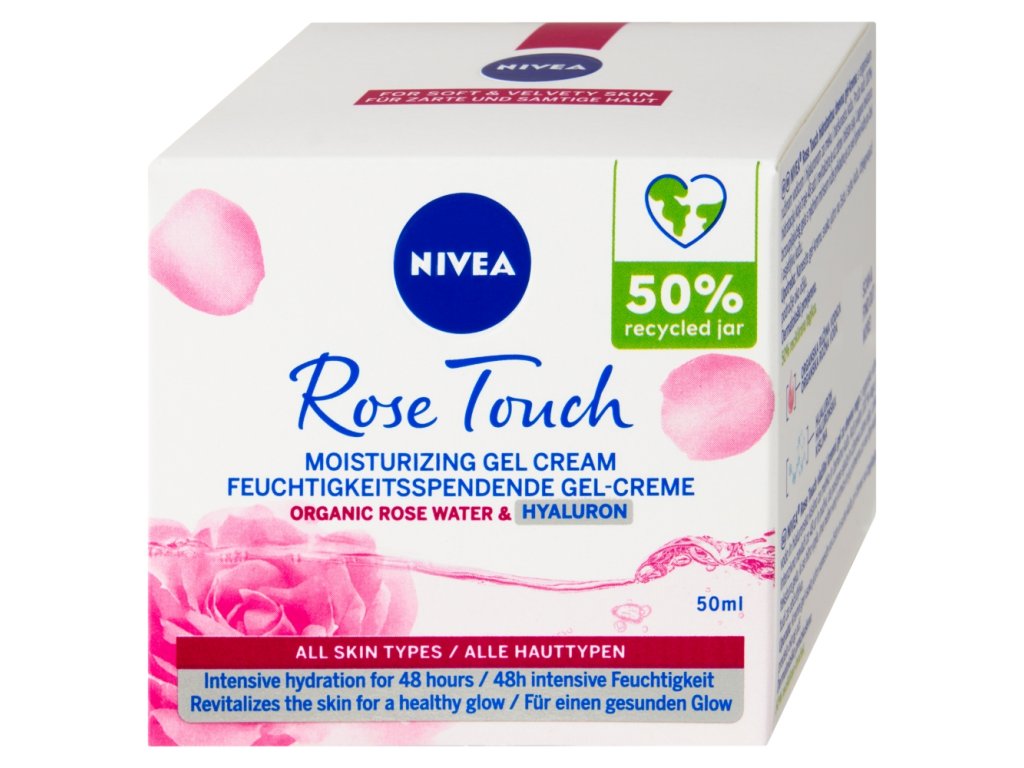 Kyselina hyaluronová se pak postará o vyhlazení drobných linek a vrásek. A nemusíte se bát, díky gelovokrémové konzistenci nehrozí žádný lepivý pocit. To je: NIVEA Hydratační denní gel-krém Rose Touch.