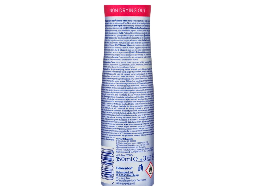 Užívejte si jedinečný objem vlasů, který navíc září třpytivými odlesky! Obdivné pohledy na sebe nenechají dlouho čekat. Pěnové tužidlo dodá vašim vlasům bohatý objem a zajistí pružnost účesu až na 24 hodin. Vaše vlasy budou navíc posílené a chráněné proti poškození teplem. Až o dvojnásobný objem se postará - NIVEA Pěnové tužidlo Diamond Volume Care.