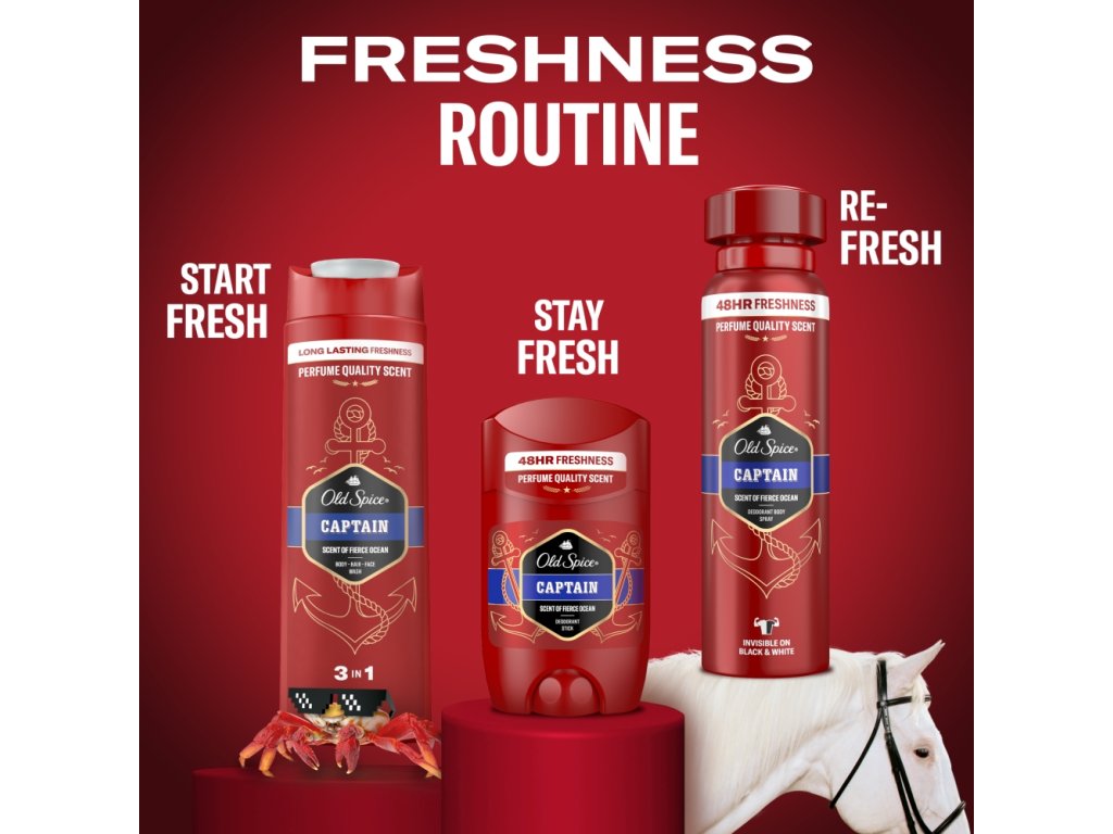 Old Spice deodorant stick Captain je symbolem nezapomenutelného muže, který si silou své osobnosti v kombinaci s vůní dokáže podmanit davy. Chrání pokožku až po dobu 48 hodin a zároveň působí proti tvorbě bílých a žlutých skvrn. Udrží vaši pokožku po celý den svěží.