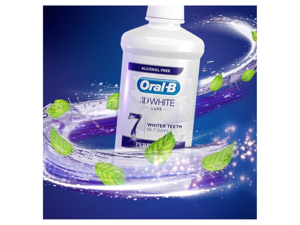Pokud se ústní voda Oral-B 3DWhite Luxe Perfection používá po čištění zubů, budou zuby bělejší už za 7 dní. Pomáhá odstraňovat ze zubů povrchové skvrny a zanechává ústní dutinu svěží bez nepříjemného štípání alkoholu.