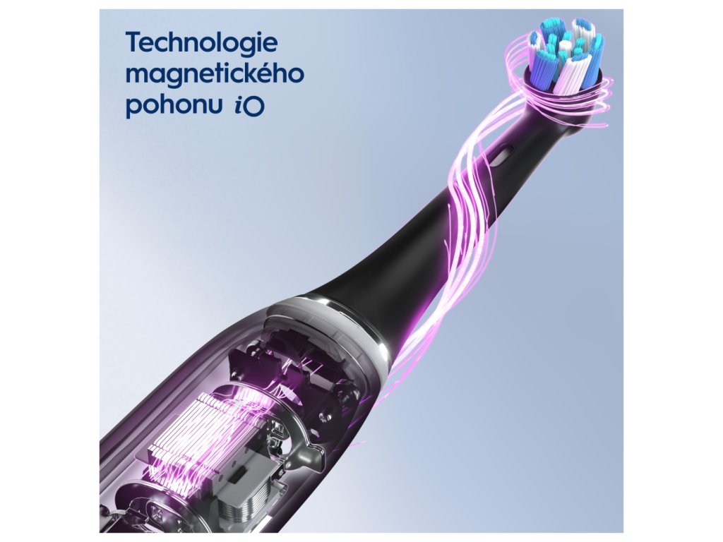 Kartáček iO10 produkuje jemné mikrovibrace, které se přenášejí do unikátní kulaté kartáčové hlavy. Konce vláken tak klouzají od zubu k zubu a čištění je nejen účinné, ale také příjemné. To vše přitom pohání jedinečný magnetický pohon, jenž vyniká i dokonale tichým chodem.