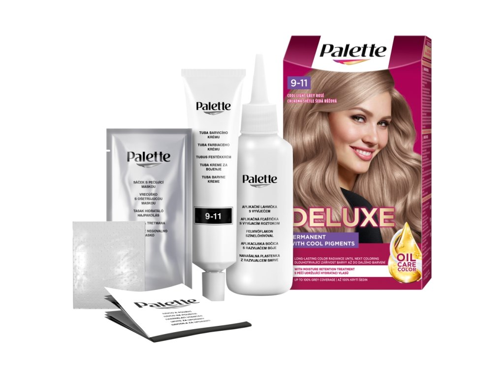 Palette Deluxe barva na vlasy s obsahem mikro olejů působí až do hloubky vlasových vláken a uzamyká v nich své studené barevné pigmenty. Barva perfektně kryje šediny a její účinek vydrží až po dobu 6 týdnů. V kombinaci s přírodními oleji hloubkově pečuje o vaše vlasy a dodává jim dokonalý lesk. Ihned po barvení se doporučuje aplikace masky obsažené v balení Palette Deluxe barva na vlasy, která poskytuje tu nejlepší péči. Pro zachování hedvábného lesku vašich vlasů po 3 týdnech od barvení použijte druhou dávku masky.