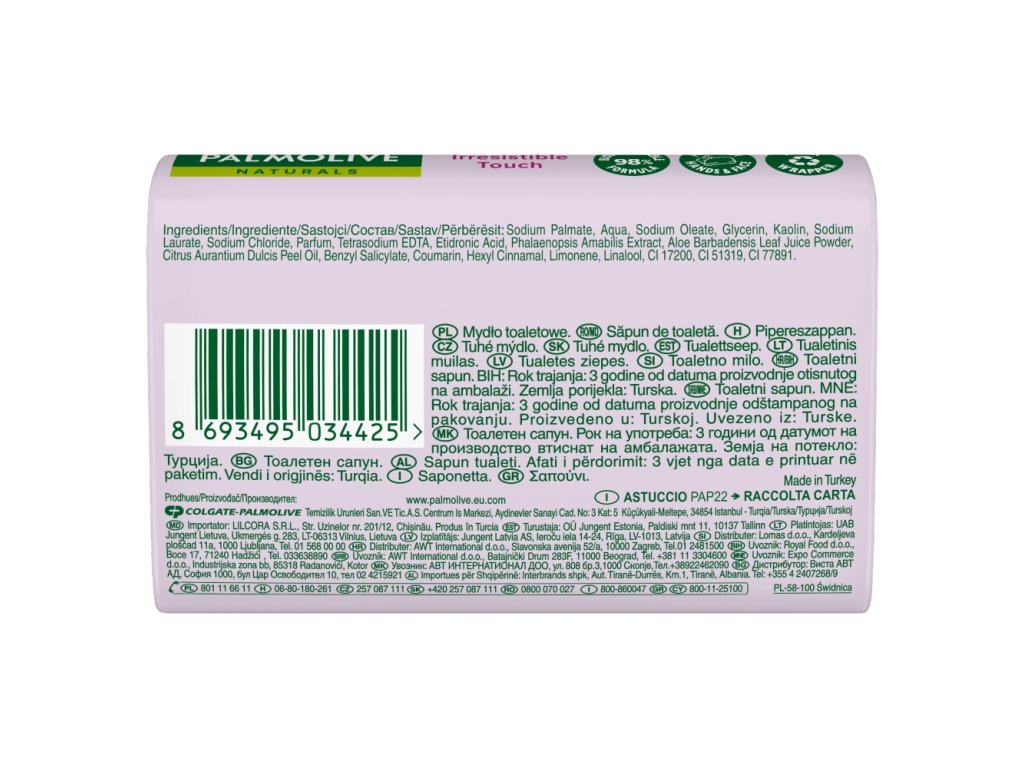 Sodium palmate *A, Aqua, Sodium tallowate *B, Sodium palm kernelate, Glycerin, Talc, Stearic acid, Parfum, Sodium chloride, Pentasodium pentetate, Aloe barbadensis leaf extract, Phalaenopsis amabilis extract, Benzyl salicylate, Butylphenyl methylpropional, Coumarin, Geraniol, Hexyl cinnamal, Limonene, Linalool, CI 17200, CI 77891, CI 51319, *A/B: viz výrobni kód