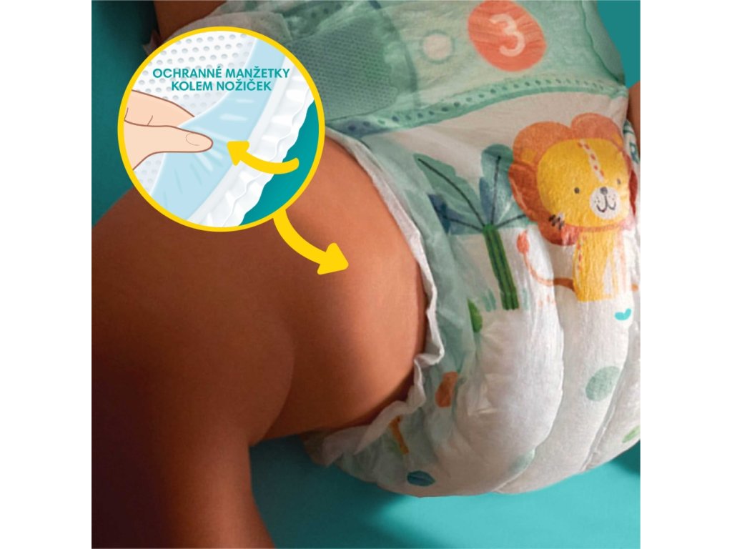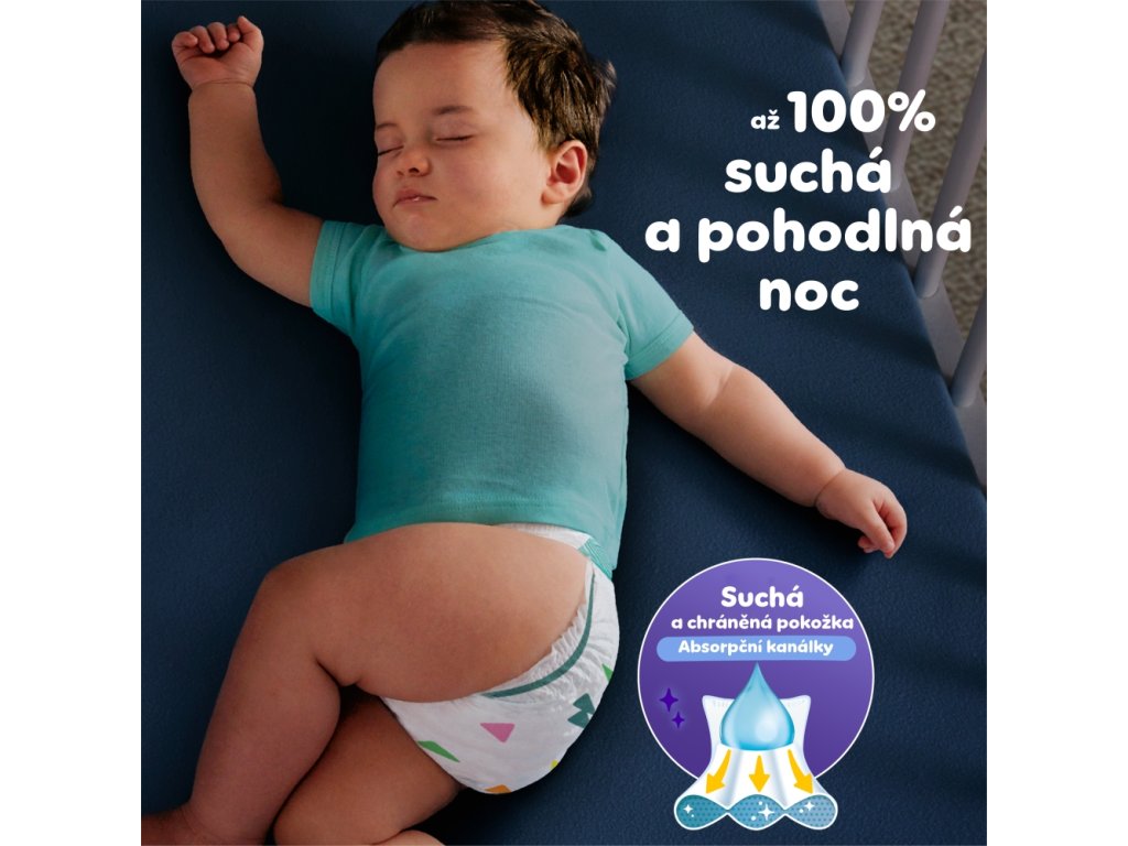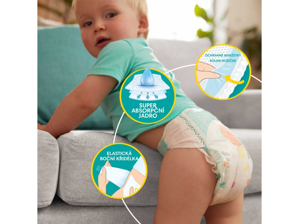 Plenky Pampers pomáhají vašemu děťátku volně se pohybovat a chrání pokožku systémem dvojí ochrany.