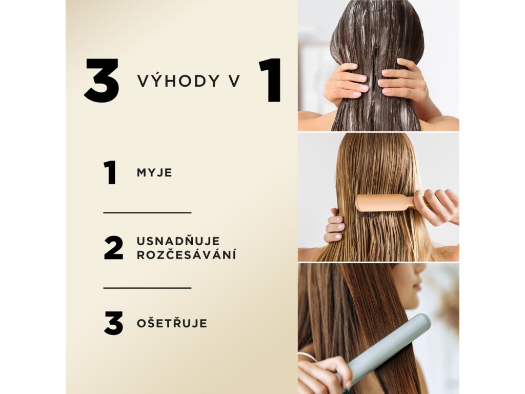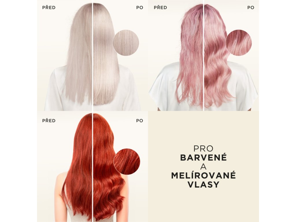 Pomáhá chránit barvené vlasy před poškozením způsobeným úpravou účesu. Vyživuje vlasy a zanechává je hebké na dotek. Dermatologicky testováno.