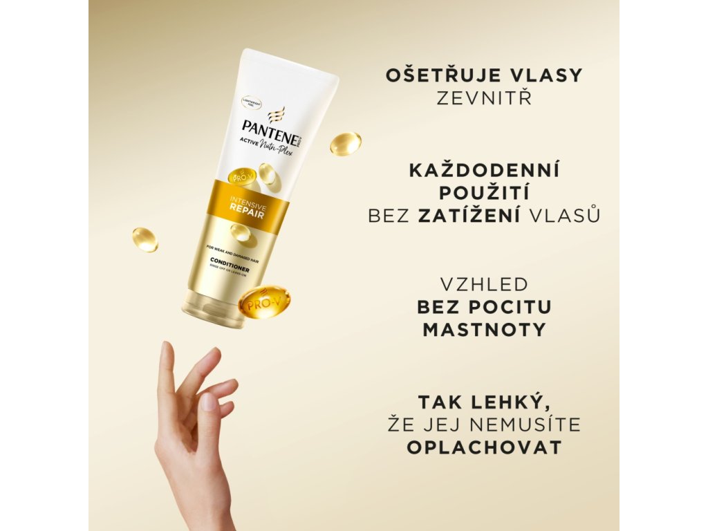 Regenerační kondicionér Pantene Pro-V Intensive Repair Conditioner je to pravé, co potřebují vaše oslabené nebo poškozené vlasy. Jeho složení obohacené o Pantene Pro-V (vyživující formule Pro-Vitamine s biotinem) a antioxidanty dodá vlasům potřebné živiny a ochrání je před poškozením volnými radikály.