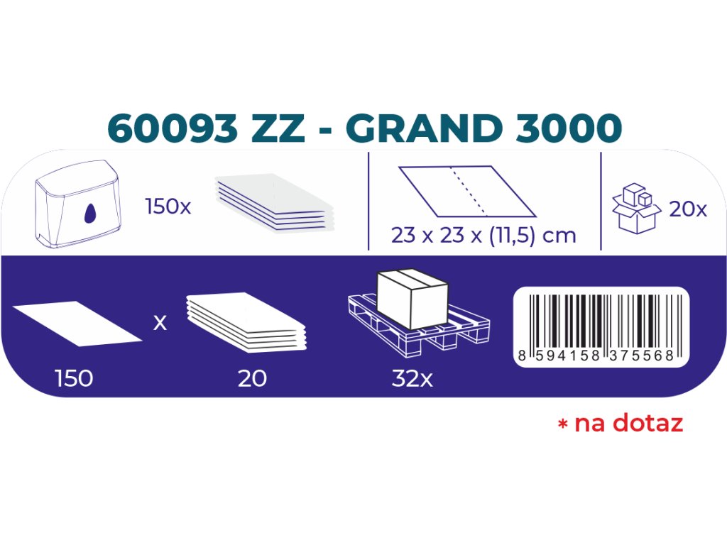 Rozměr listu: 23 × 23 cm – univerzální velikost pro zásobníky typu ZZ (V-skládání), umožňuje snadné a hygienické dávkování.