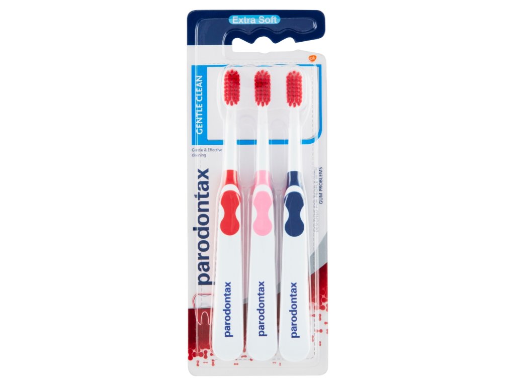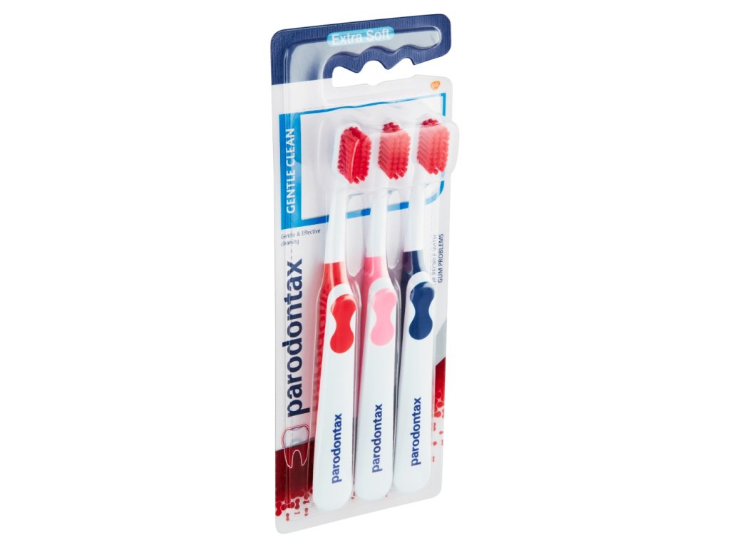 Pomáhá odstranit plak a předchází problémům s dásněmi (při čištění dvakrát denně). Doporučovaná výměna zubního kartáčku je každé tři měsíce. Kartáčky parodontax jsou speciálně navrženy tak, aby pomáhali předcházet potížím s dásněmi a usnadňovali čištění zubů. Díky malé hlavě a měkkým štětinkám s dvojitou délkou jsou šetrné k dásním, ale účinně odstraňují plak, který je jednou z hlavních příčin potíží s dásněmi. Kartáček je vybaven ergonomicky tvarovanou rukojetí, která zajišťuje bezpečný úchop při čištění. Na zadní straně hlavy kartáčku paradontax Extra Soft se nachází měkká část k čištění jazyka, která se používá pohybem drážek směrem dopředu po povrchu jazyka.