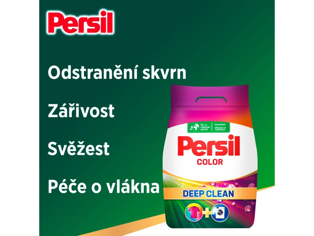 Persil prací prášek Color - užijte si dokonale čisté prádlo a zářivost barev vašeho oblečení při každém praní.Prací prášek na barevné prádlo pomáhá zachovat jas barev a zároveň poskytuje úžasný čisticí výkon a dodává pračce hygienickou svěžest díky novému složení. Naše složení v tomto prášku pro barevné prádlo je navrženo tak, aby udrželo barvy zářivé a poradilo si i s těmi nejodolnějšími skvrnami. Prací prostředek, který je účinný vůči skvrnám, dokáže být šetrný vůči barvám.Koncentrovaný prací prostředek je navržený tak, aby zajistil více než jen svěží oblečení, působí ještě hlouběji v mechanismu pračky a účinně odstraňuje nepříjemné pachy.Pro čistější svět: Odolné vůči skvrnám, šetrné k planetě, složení obsahuje 92 % biologicky odbouratelných složek* a je vyráběno ve 100% recyklovatelném obalu. Účinné při nízkých teplotách - praní ve studené vodě začíná při 20 °C, aby se šetřila energie při každém praní. Nyní i v budoucnu se Persil zavázal poskytovat hloubkové čištění prádla a přitom být šetrný k planetě. Šetřete energii díky silnému složení Persil Deep Clean, které přináší efektivní výsledky i při plné pračce a při nízkých teplotách.Hlavní výhody produktu:Hloubkově čistí prádlo a zachovává zářivé barvyProniká hlouběji do mechanismu pračky a odstraňuje nepříjemné pachy100% recyklovatelné obaly a 92% biologicky rozložitelné složky*Prací prášek je účinný i při plně naplněné pračceŠetřete energii praním při nízkých teplotách začínajících na 20 °C*Vztahuje se na organické složky podle OECD 301/302