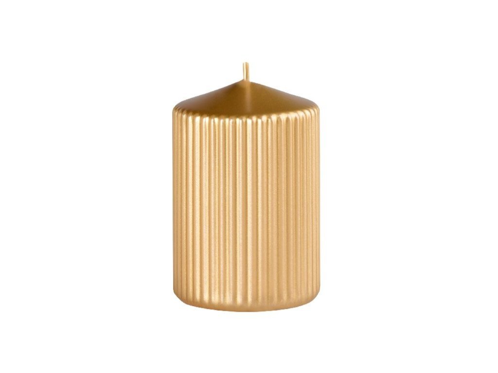 Tato rýhovaná svíčka ve válec tvaru v metalické zlaté barvě je elegantním doplňkem pro každý stůl. Její rozměry jsou 65x100mm.Doplňkové parametry
