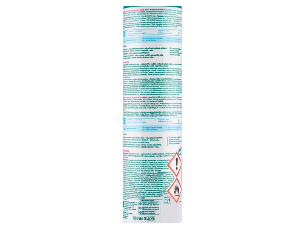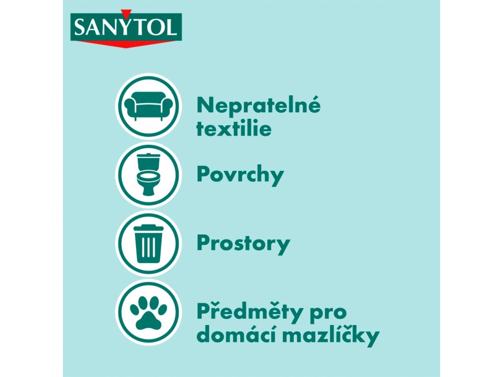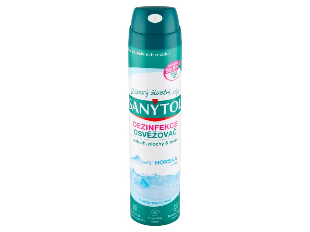 SANYTOL vyčistí vzduch a vydezinfikuje povrchy v jednom jediném kroku. Jeho složení zajišťuje dokonalou hygienu a zanechává příjemně svěží vůni. Zahubí 99,9 % bakterií, plísní a virů, včetně viru chřipky typu A (H1N1).