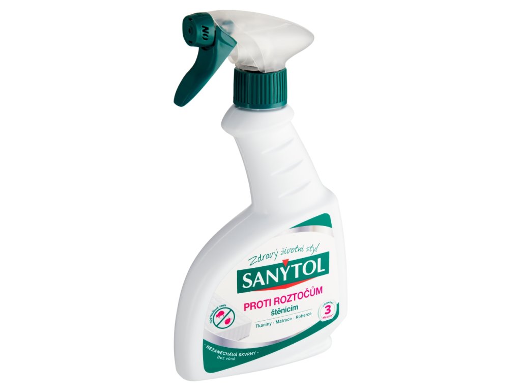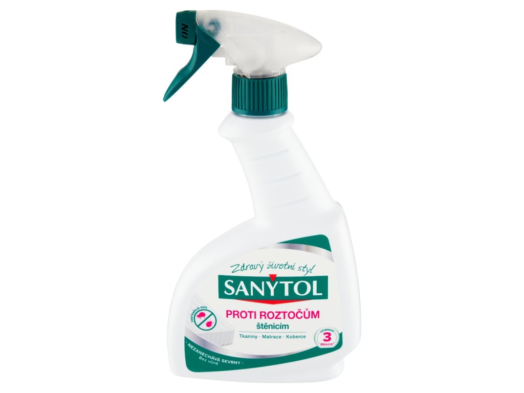 Sanytol proti roztočům 300 ml - odstraňuje 100% roztočů a štěnic, zabraňuje jejich rozmnožování a dezinfikuje prostředí domácnosti. Nezpůsobuje skvrny a nezanechává zbytkový zápach. Je ideální na tkaniny, matrace nebo koberce.