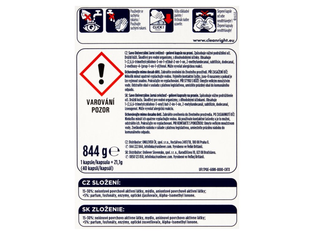 Nemusíte složitě vzpomínat, do jaké nádržky patří jaký prostředek. Kapsli snadno a rychle vložíte mezi prádlo a na praní nemusíte nějakou chvíli myslet. Univerzální gelové kapsle jsou díky svému složení vhodné na všechny barvy prádla. Můžete se těšit na stejnou barevnou intenzitu prádla i po mnoha vypráních. Díky kapslím konečně vyperete i skvrny, aniž byste prádlo předtím jakkoli předpírali. V balení pracích kapslí SAVO se jich ukrývá 40 ks. S těmito kapslemi už nemusíte nosit domů těžké prací prášky a gely.