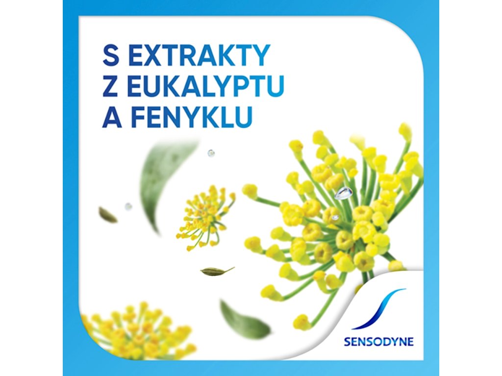 Aqua, Sorbitol, Hydrated silica, Glycerin, Potassium nitrate, Sodium lauryl sulfate, Aroma, Xanthan gum, Titanium dioxide, Sodium fluoride, Sodium saccharin, Sodium hydroxide, Eucalyptus globulus leaf oil, Limonene, Foeniculum vulgare (fennel) oil, CI 19140, CI 42090, Obsahuje fluorid sodný 0,315% w/w (1450 ppm F).