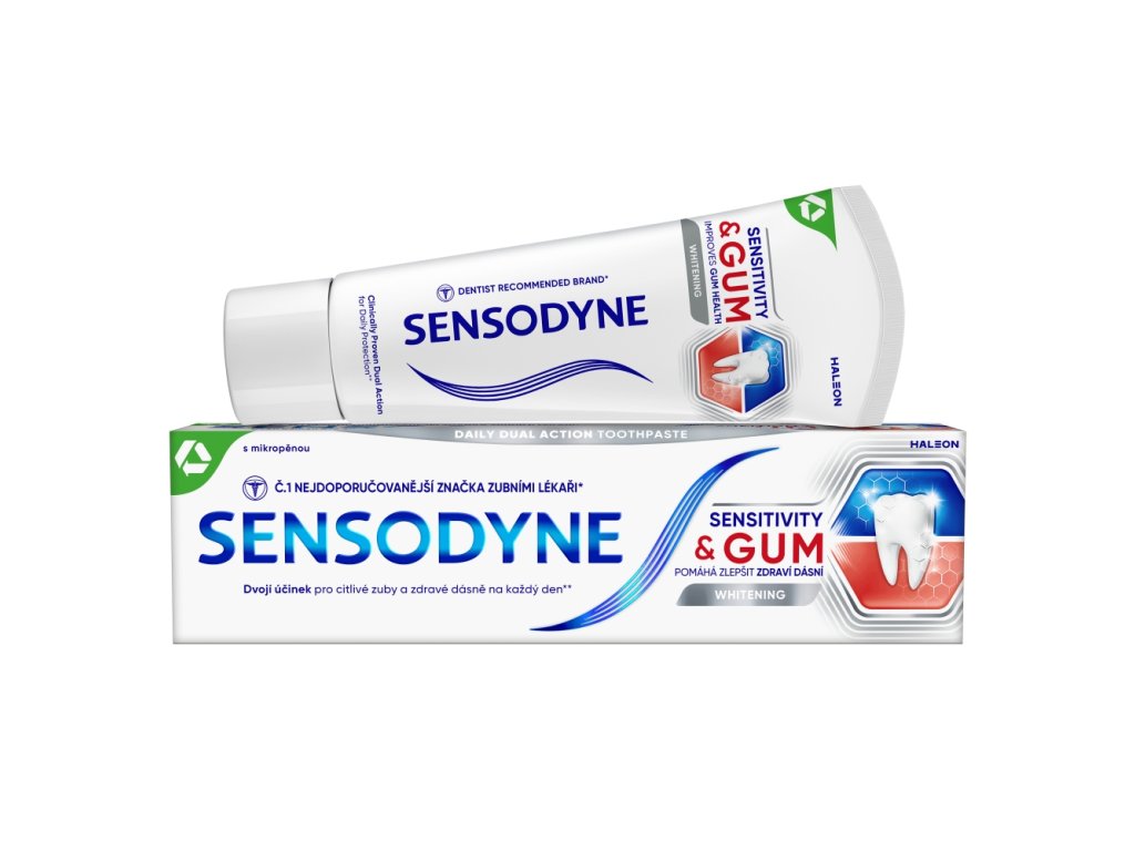 Zubní pasta Sensodyne Sensitivity & Gum přináší klinicky ověřenou úlevu citlivým zubům a pomáhá zlepšit zdraví dásní. Vytváří ochrannou vrstvu na citlivých místech zubů a přináší úlevu citlivým zubům. Odstraňuje bakterie v zubním plaku, a tím pomáhá zmírnit problémy s dásněmi. Nyní můžete řešit oba problémy najednou pomocí jedné speciální zubní pasty. Zubní pasta Sensodyne Sensitivity & Gum je zubní pasta s fluoridem pro každodenní použití.