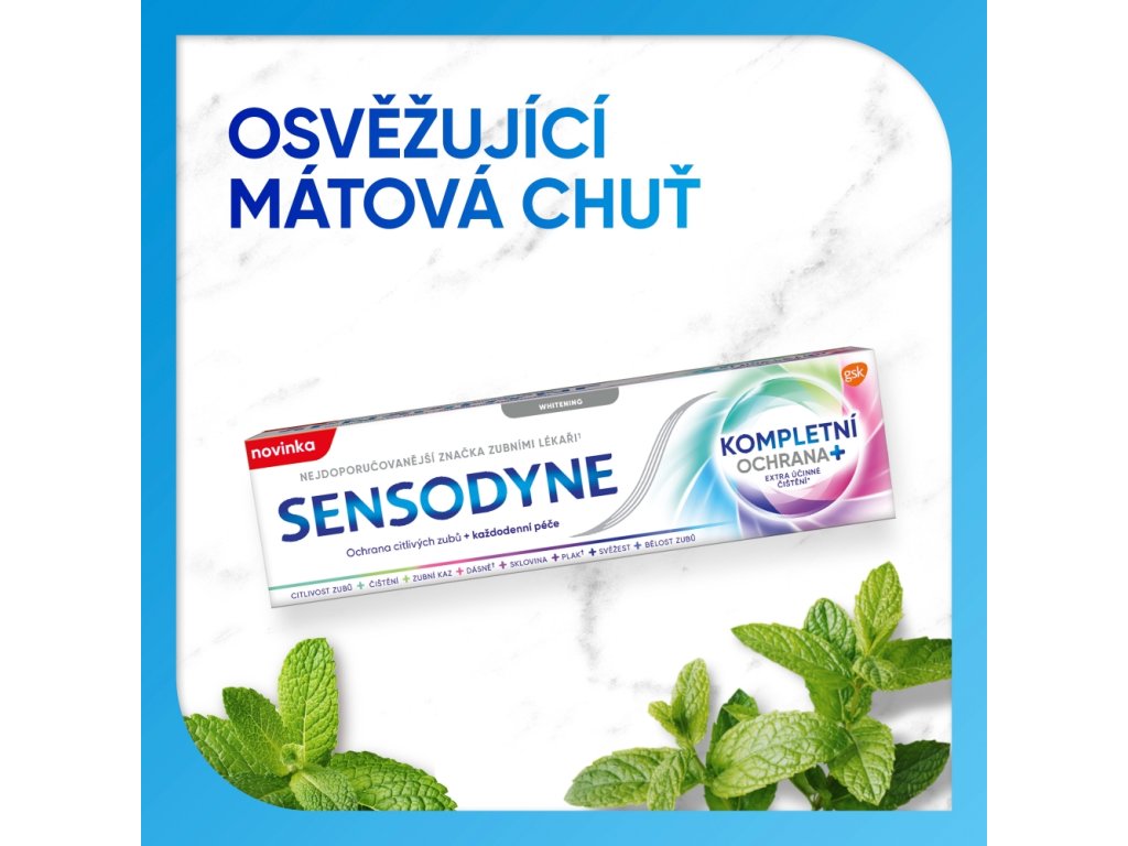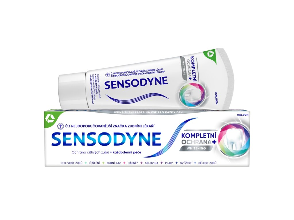 Sensodyne kompletní ochrana whitening uleví od bolesti citlivých zubů do 60 sekund. Zubní pasta Sensodyne s rychlým nástupem účinku přináší klinicky ověřenou úlevu od bolesti citlivých zubů. Fluorid cínatý obnovuje ochrannou vrstvu na obnaženém dentinu.