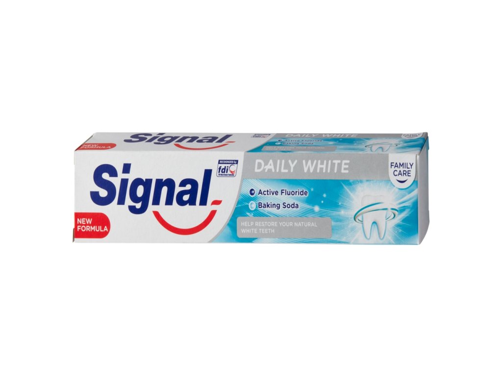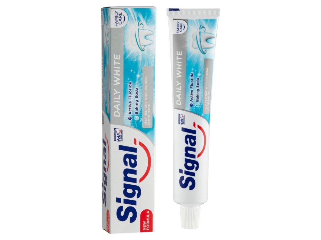 Účinné složení zubní pasty Signal Daily White Family Care s obsahem bikarbonátu sodného citlivě pomáhá znovu objevit přírodní bělost zubů vaší rodiny. Obsah fluoridu posiluje sklovinu a zuby jsou lépe chráněné proti vzniku zubního kazu. Pasta je speciálně navržena pro každodenní použití celou rodinou.