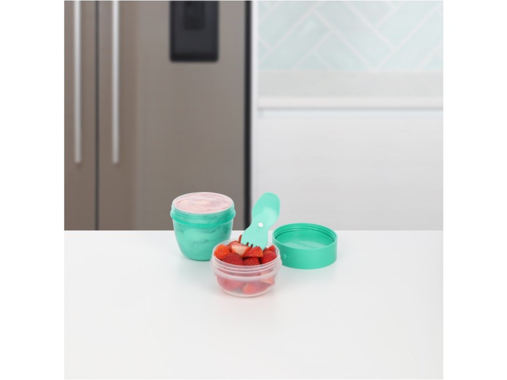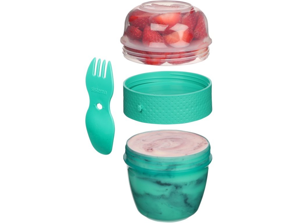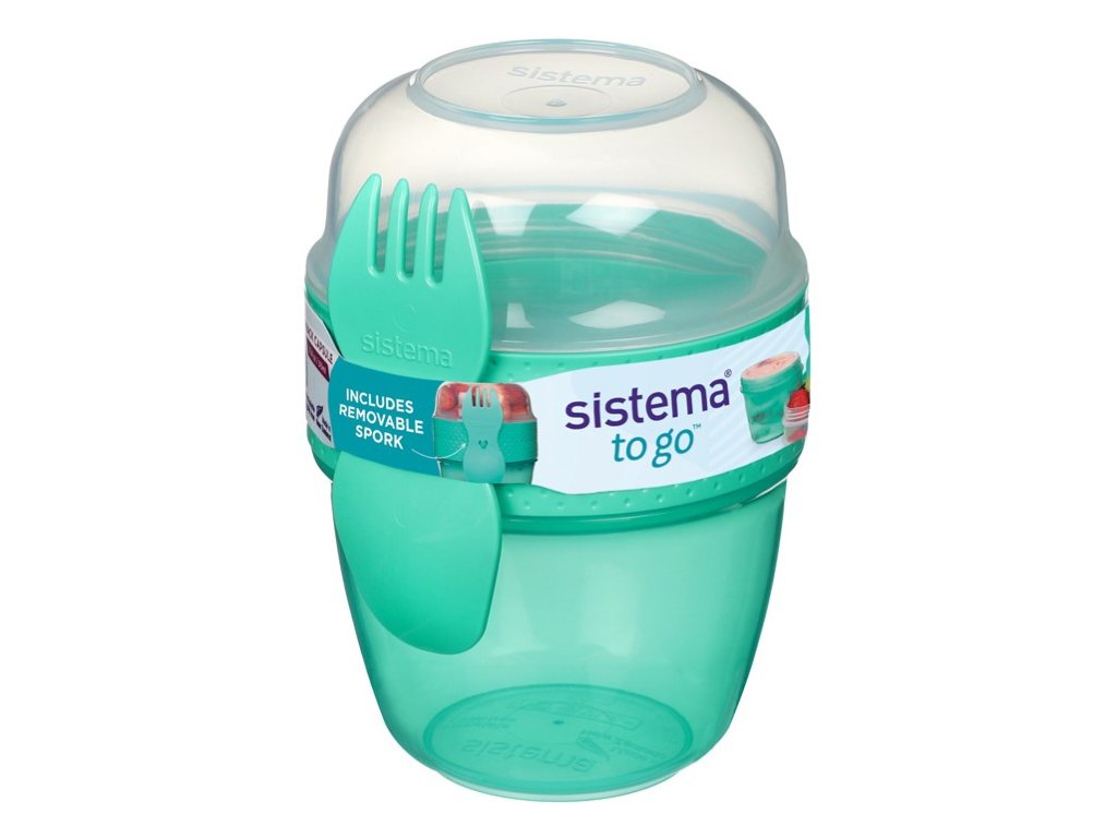 Sistema® 515 ml TO GO™ Snack Capsule se 2 přihrádkami a vidličkou/lžičkou je chytrý a praktický pomocník pro všechny, kteří si chtějí vzít zdravou a chutnou svačinku nejen na cesty. Praktický tvar pohárku umožňuje ukládat odděleně různé druhy potravin a promíchat je těsně před konzumací. Ve spodní části můžete uložit třeba jogurt, v horní jakoukoliv vhodnou přísadu (müsli, ovoce, sušené plody nebo cereálie). Díky přiložené vidličce/lžičce můžete svoje oblíbené pochoutky konzumovat kdekoliv. Stohovatelný tvar zajišťuje maximální využití prostoru ve spíži, chladničce a mrazničce. Výhody: • Univerzální kombinace vidličky a lžičky součástí • Dvě oddělené přihrádky • Šroubovací zavírání • Odolný plastDoplňkové parametry