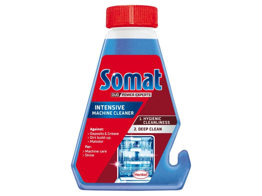 Somat intenzivní čistič myčky odstraňuje vodní kámen a mastné usazeniny v myčce, na ostřikovacích ramenech a filtru – pro hygienickou čistotu. Při pravidelném používání (jednou za 3 měsíce). lze prodloužit životnost Vaší myčky. Praktická lahev Somat s háčkem je vhodná pro všechny myčky. Při používání čističe myčky prosím nepřidávejte prostředek na nádobí, ani nenechávejte nádobí v myčce.