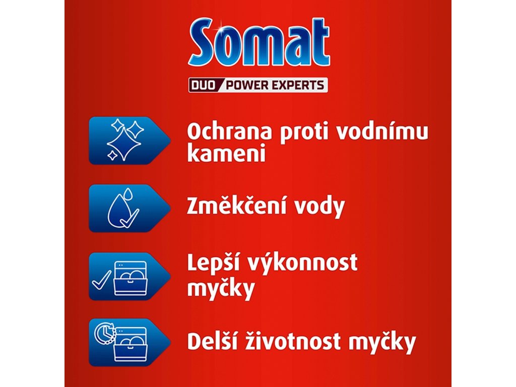 Sůl Somat s účinkem proti vodnímu kameni optimálně chrání myčku, ostřikovací ramena a trubky před vodním kamenem. Produkt pomáhá zajistit dokonalou funkci zařízení na změkčování vody, které mění kohoutkovou vodu na vodu měkkou. Díky tomu může mycí prostředek fungovat s maximální účinností a zabraňuje se škodlivému usazování vodního kamene.