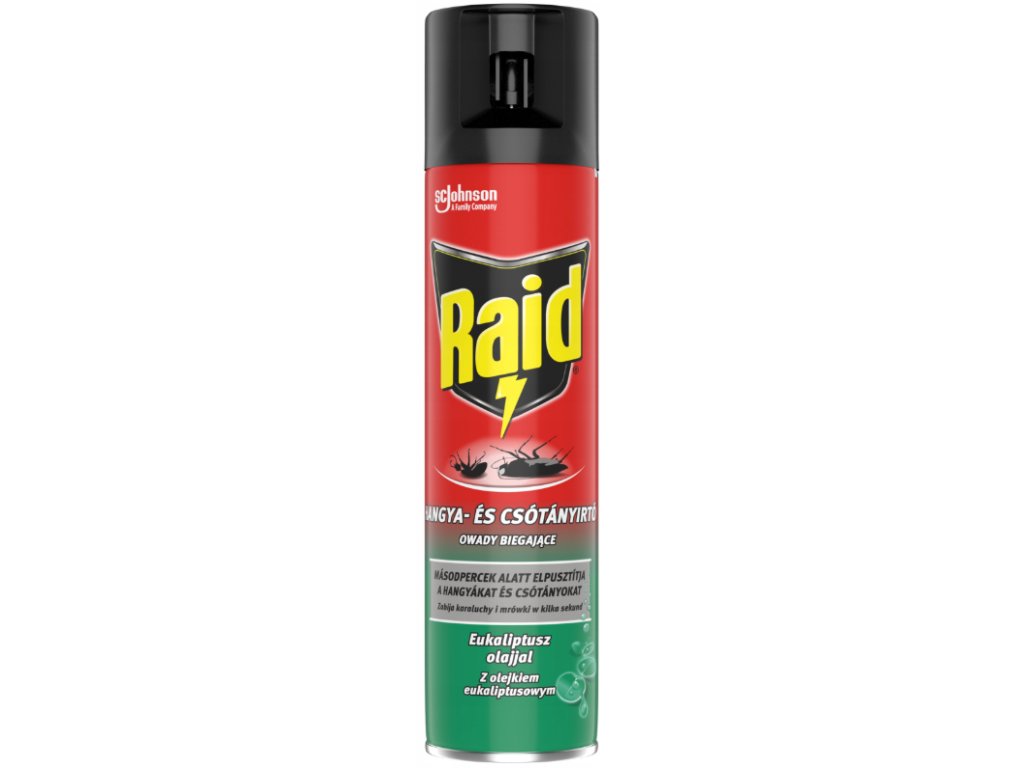 Insekticidní aerosol Raid od společnosti SC Johnson je určený k účinnému hubení lezoucího hmyzu v domácnosti i jejím okolí. Působí rychle a pomáhá likvidovat šváby, mravence, pavouky nebo rybenky, a to včetně jejich vajíček. Sprej lze použít přímo na hmyz nebo na místa, kde se ukrývá a pohybuje, například štěrbiny, rohy místností či okolí potrubí. Produkt má příjemnou vůni s eukalyptovým olejem a je vhodný pro použití v interiéru i exteriéru.