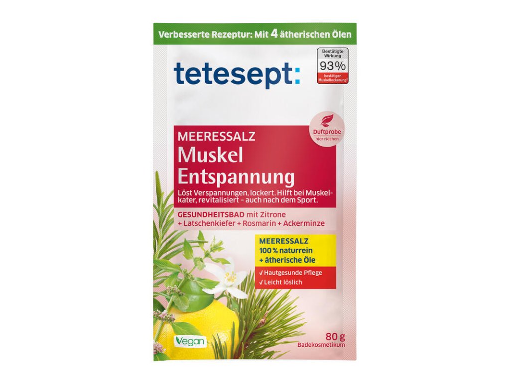Rozmarýnový a eukalyptový olej Sůl do koupele tetesept Uvolnění svalů je speciální přísada do koupele s prospěšnou mořskou solí určenou k relaxaci a revitalizaci unavených svalů. Unikátní složení kombinuje citronový olej, borovicový olej, rozmarýnový a mátový olej. Tato vybraná kombinace byla přizpůsobena potřebám bolavých a napnutých svalů. Esenciální oleje rozvíjejí ve spojení s teplou vodou jejich prokrvení. Pociťte uvolnění svalové bolesti a napětí v ramenou a šíji. Kromě toho mořská sůl tetesept udržuje pokožku zdravou přirozeným způsobem díku obsahu minerálů. Vzácná mořská sůl „La Baleine“ od značky tetesept vzniká ve francouzských saliništích. V interakci vody, slunce a větru sůl přirozeně krystalizuje s minerály a stopovými prvky z mořské vody do formy bílého zlata. Vyvinuto podle nejnovějších vědeckých poznatků. Kožní kompatibilita je dermatologicky potvrzena. Bez konzervačních látek, parafinů, silikonů, minerálních olejů a bez alkaloidů. Veganský produkt. Použití: nasypte mořskou sůl tetesept do proudu tekoucí vody o teplotě 36-38 °C a vychutnejte si 10-20minut trvající koupel. Po použití omyjte vanu horkou vodou a odstraňte zbytky produktu. Varování: nevhodné pro děti. Použijte pouze na zdravou pokožku. Vyhněte se kontaktu s citlivými částmi těla.Doplňkové parametry