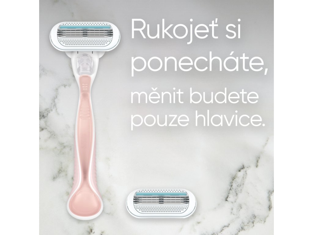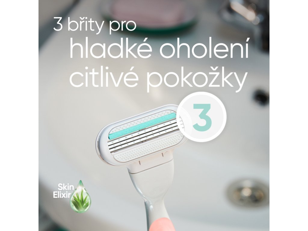 Holicí hlavice má 3 břity a jsou navržené pro ženy s citlivou pokožkou. Holicí strojek má zvlhčující pásek SkinElixir a břity kopírující křivky těla, takže zajišťují hladké oholení.