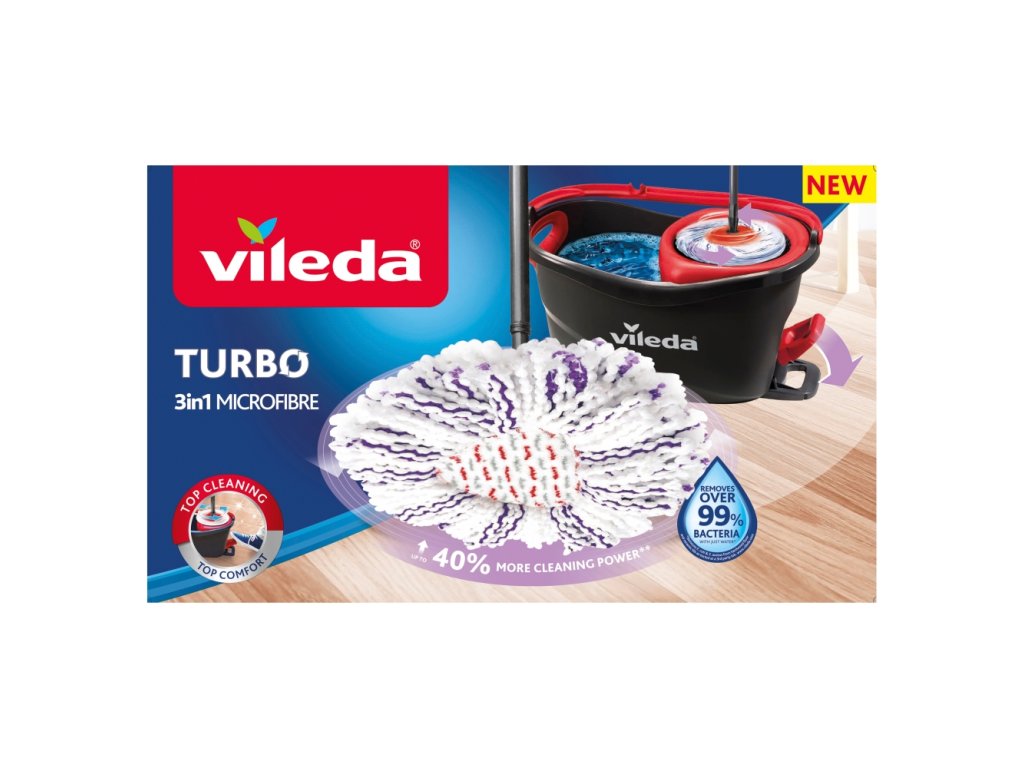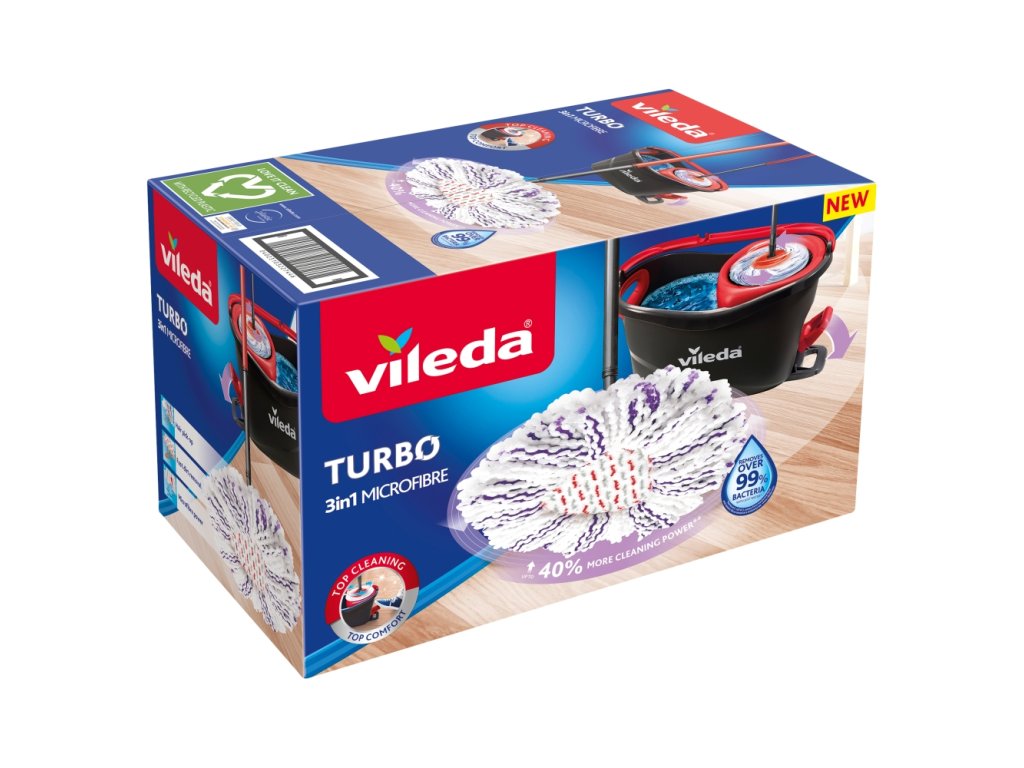 Rotační mop a kbelík Vileda Turbo se šlapacím pedálem je ideálním čisticím pomocníkem pro všechny podlahy. Jeho rotační ždímač usnadňuje a urychluje úklid podlah. Kompletní sada je dodávána s třásňovým mopem a kbelíkem s rotačním ždímačem a šlapacím pedálem. Je vhodný na všechny tvrdé povrchy podlahy včetně dřeva a laminátu. Po opláchnutí není nutné ručně ždímat mop - 360 ° systém odstřeďování za vás udělá tu těžkou práci! Nejen, že se snadno používá, ale také důkladně čistí podlahy. 3in1