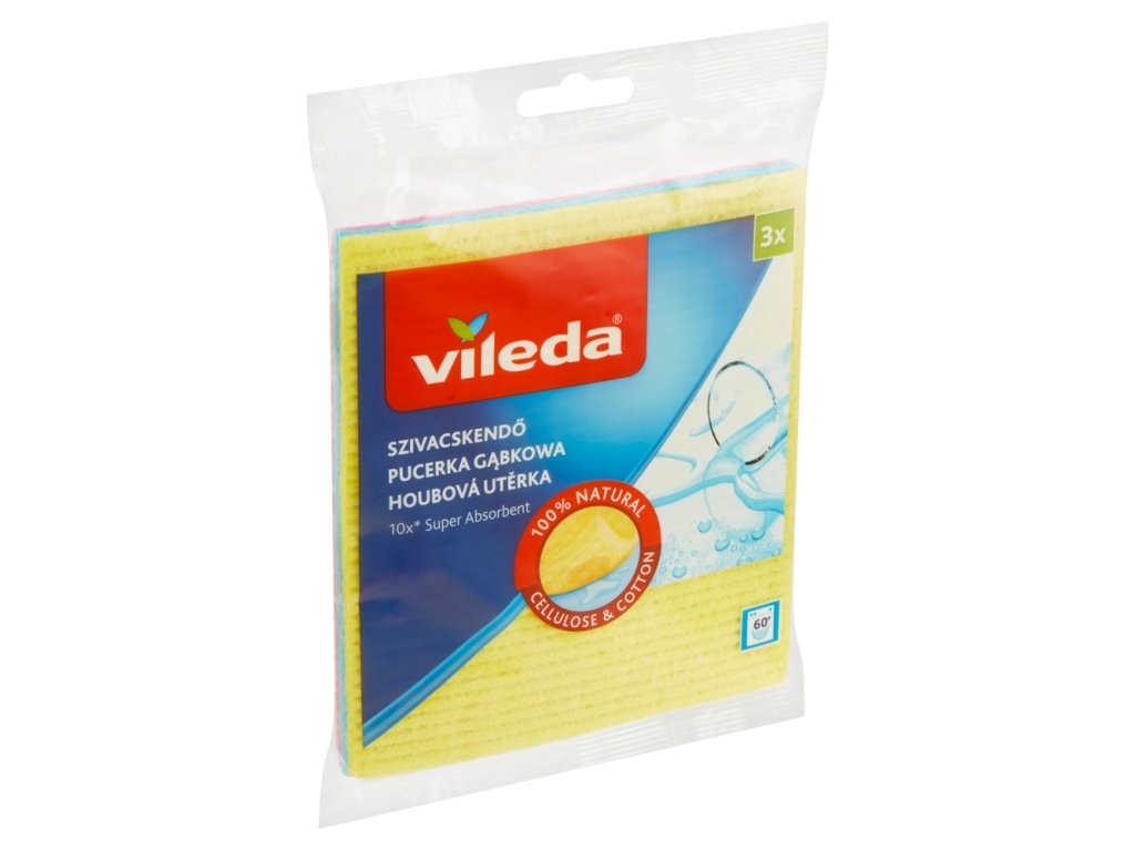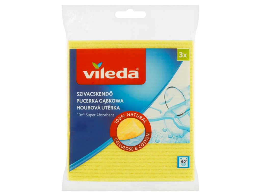 Vileda houbová utěrka vyrobená ze 100% přírodního materiálu celulózy a bavlny. Celulóza zaručuje vysokou savost, dokáže nasát až patnácti násobek svojí váhy. Bavlna zajišťuje odolnost a sílu hadříku. Absorbuje až 100 ml vody a lze jej snadno vyždímat v rukou. Povrch hadříku je odolný a homogenní. To zaručuje, že se hadřík nedrolí a neodlupuje po několika málo použitích a díky tomu hadřík vykazuje velmi vysokou životnost.