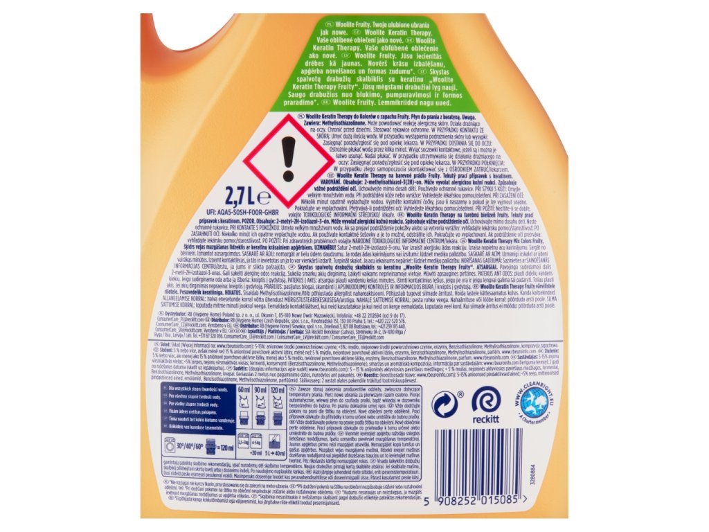 | Bezpečnostní upozornění: | Woolite Keratin Therapy na barevné prádlo Fruity. Tekutý prací přípravek s keratinem. VAROVÁNÍ. Obsahuje: 2-methylisothiazol-3(2H)-on. Může vyvolat alergickou kožní reakci. Způsobuje vážné podráždění očí. Uchovávejte mimo dosah dětí. Používejte ochranné rukavice. PŘI STYKU S KŮŽÍ: Omyjte velkým množstvím vody. Při podráždění kůže nebo vyrážce: Vyhledejte lékařskou pomoc/ošetření. PŘI ZASAŽENÍ OČÍ: Několik minut opatrně vyplachujte vodou. Vyjměte kontaktní čočky, jsou-li nasazeny a pokud je lze vyjmout snadno. Pokračujte ve vyplachování. Přetrvává-li podráždění očí: Vyhledejte lékařskou pomoc/ošetření. PŘI POŽITÍ: Necítíte-li se dobře, volejte TOXIKOLOGICKÉ INFORMAČNÍ STŘEDISKO/lékaře. |